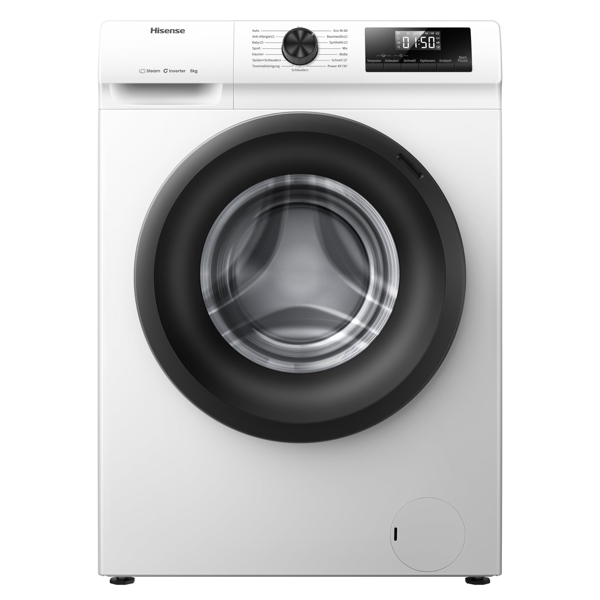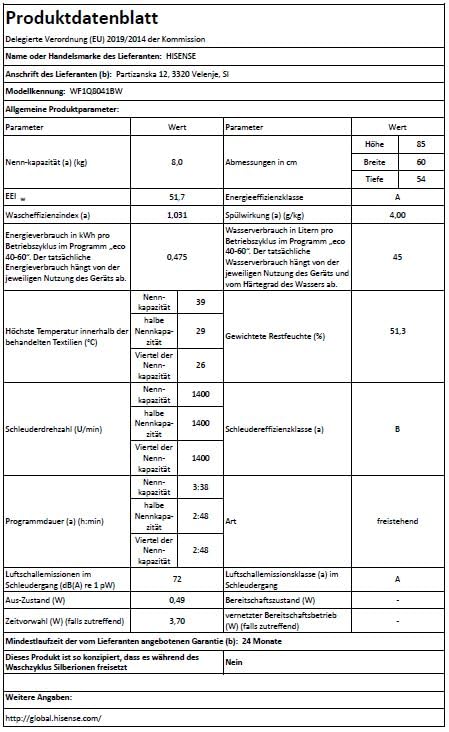 Einzelheiten: Hisense WF1Q8041BW Waschmaschine mit Dampffunktion /8KG /1400 U/Min /15 Programme/Anti-Allergie Programm/Baby-Wäsche/AutoWash/QuickWash/Daunen/Eco/Power 49' / Verzögertes Ende/EEK: A/Weiß